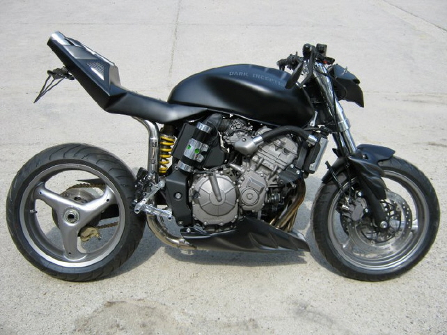 Hornet 600 PC34 - Motor original, sämtl. Deckel lackiert - Krümmer umgeschweißt, Eigenbau Zwischenrohr - Shark Conic mit Blende im Höcker - NLF Gabelbrücken, poliert - Ducati 748 Schwinge, Felgen u Wilbers Federbein - France Equipement Stahlflex -Heckrahmen Eigenbau, Rahmen umgeschweißt - MGM Kotflügel, MGM Heck, MGM Bugspoiler, OCP Maske - Koso-Digi Tacho - ABM Streetbar mit Eigenbau Griffen, Shino Spiegel - Kellermann Blinker - MGM Kennzeichenhalter, Eigenbau Ausgleichsbehälter, Elektrik komplett überarbeitet, Pop up Tankdeckel - Lackierung Schwarz matt Uni, Silber matt